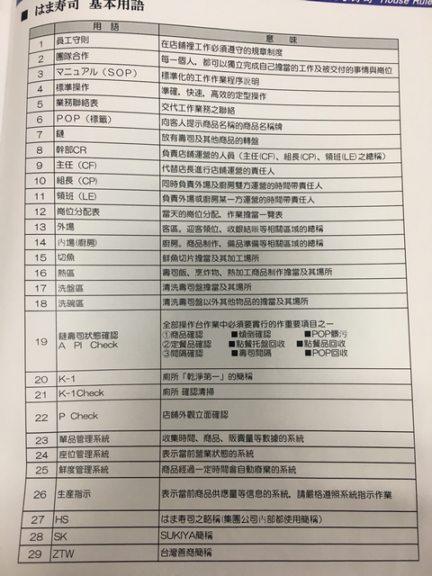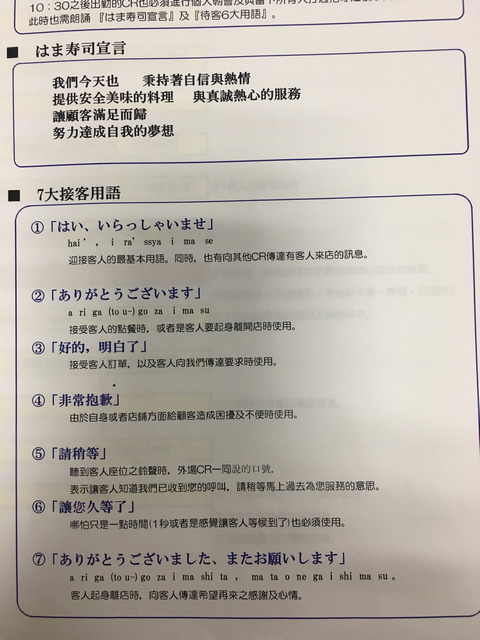 HAMA壽司宣言和七大接客用語每天開始工作前都要喊一次。